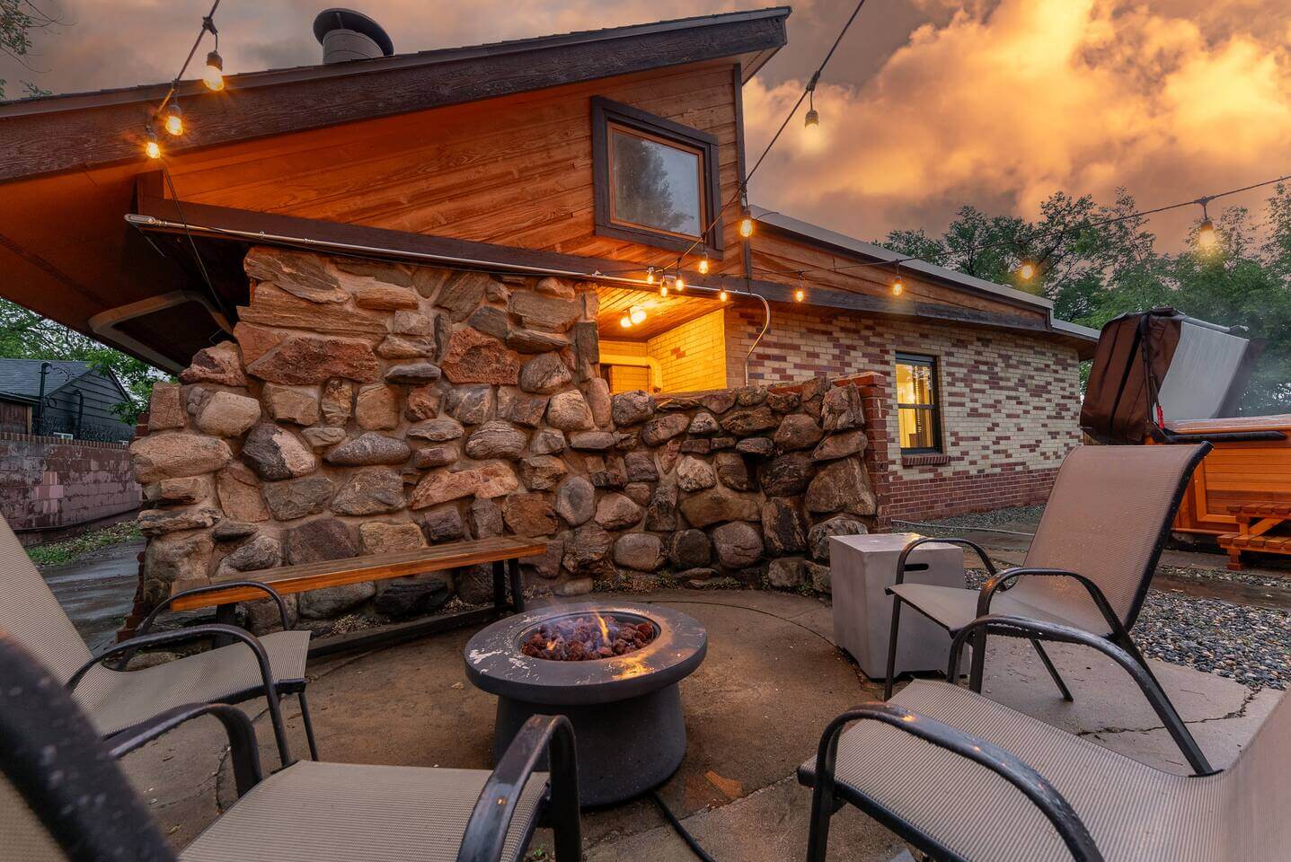 ✔Back patio with string lights, 4 chairs, a bench that fits 3 people, and a propane fire pit